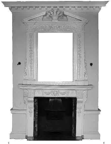 Above the fire surround is an overmantle mirror which extends to almost ceiling height and a pediment with a central fruit basket design provides a grand decoration. The fruit basket detail would certainly fit Kent’s style as his interior decorations were bold, with three-dimensional solidity.12 Below the pediment is a frieze with foliage decoration and a pair of central griffin heads.