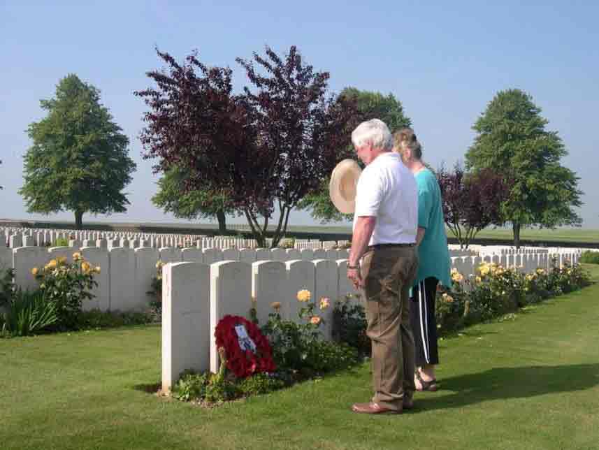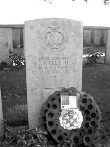It has also been my privilege to lay wreaths at the graves on the 90th anniversary of the battle of the Somme, of Charles Andrews, one of 7,127 buried in the largest cemetery on the Somme, Serre Road No. 2, and Rifleman John James Halls, awarded the D.C.M, in Sucrerie Military Cemetery, where during the days before the battle mass graves had been dug to receive the casualties, little did they envisage the terrible numbers there would be. It is quite possible that he and his battalion had marched past these very graves on their way up to the front-line. Today he lies with 1,103 of his comrades. The inscription chosen by his family reads, ‘His memory is as dear today as in the year he passed away’.
